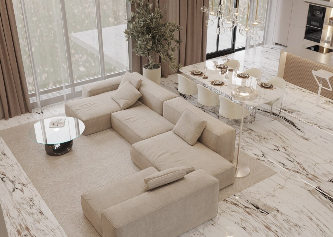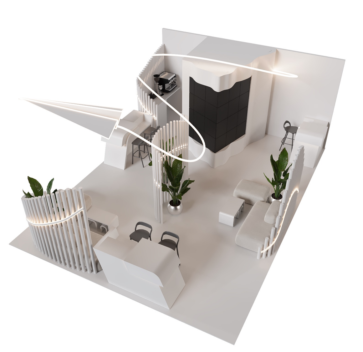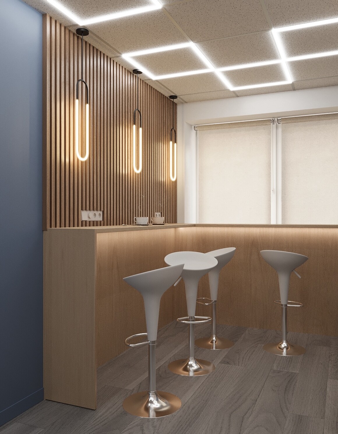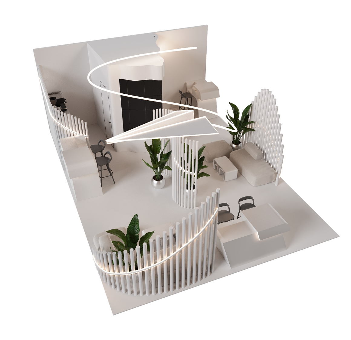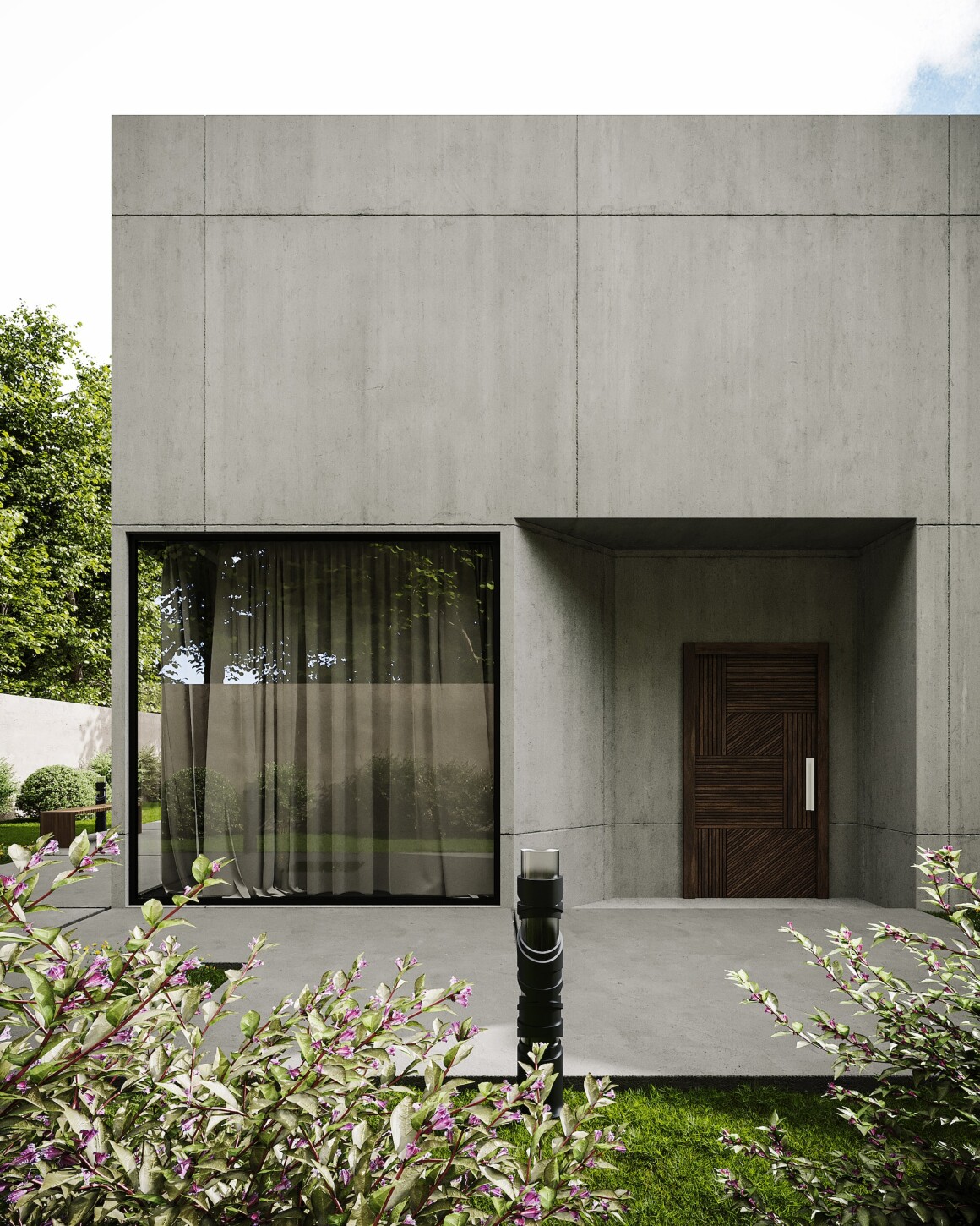 Дом состоит из двух этажей вписанные в крутой склон. Белоснежный бетонный объем второго этажа парит над ландшафтом и открывает панорамы из всех помещений на красоту окружающей природы. Из-за особенностей рельефа входная группа расположена, непосредственно, на втором этаже, где сосредоточились гостиная зона, зона столовой, кухня, кабинет, санузлы и вспомогательные помещения. Также, часть этого этажа отдана под техническую зону с котельной, постирочной и другими помещениями.