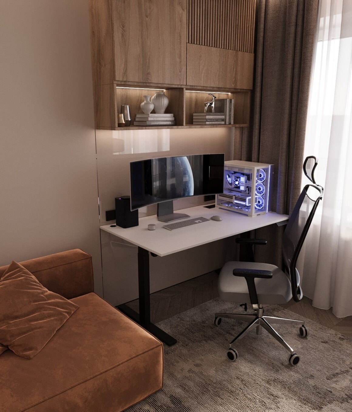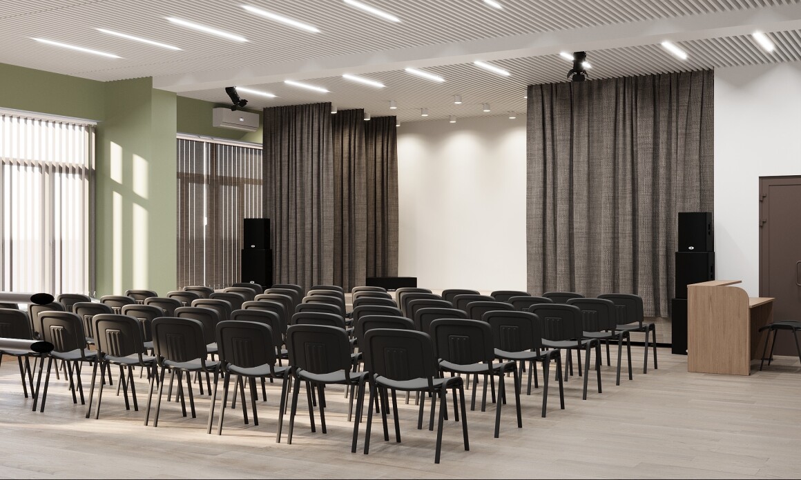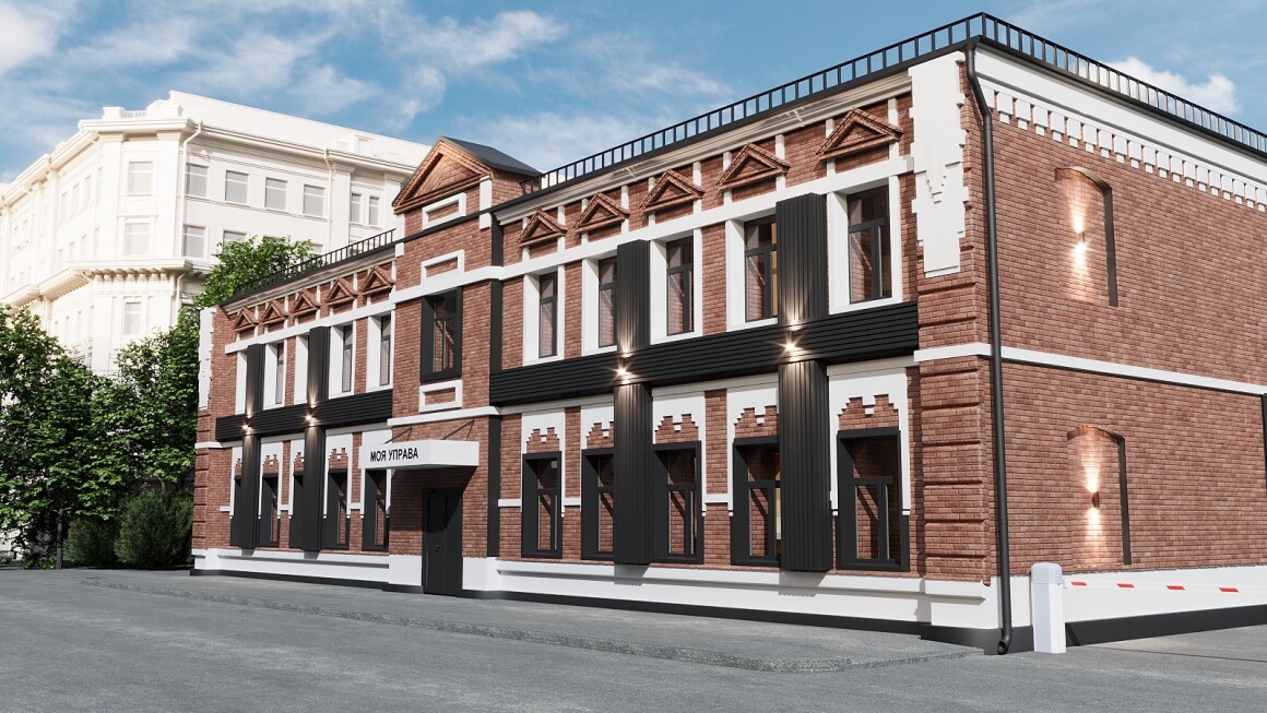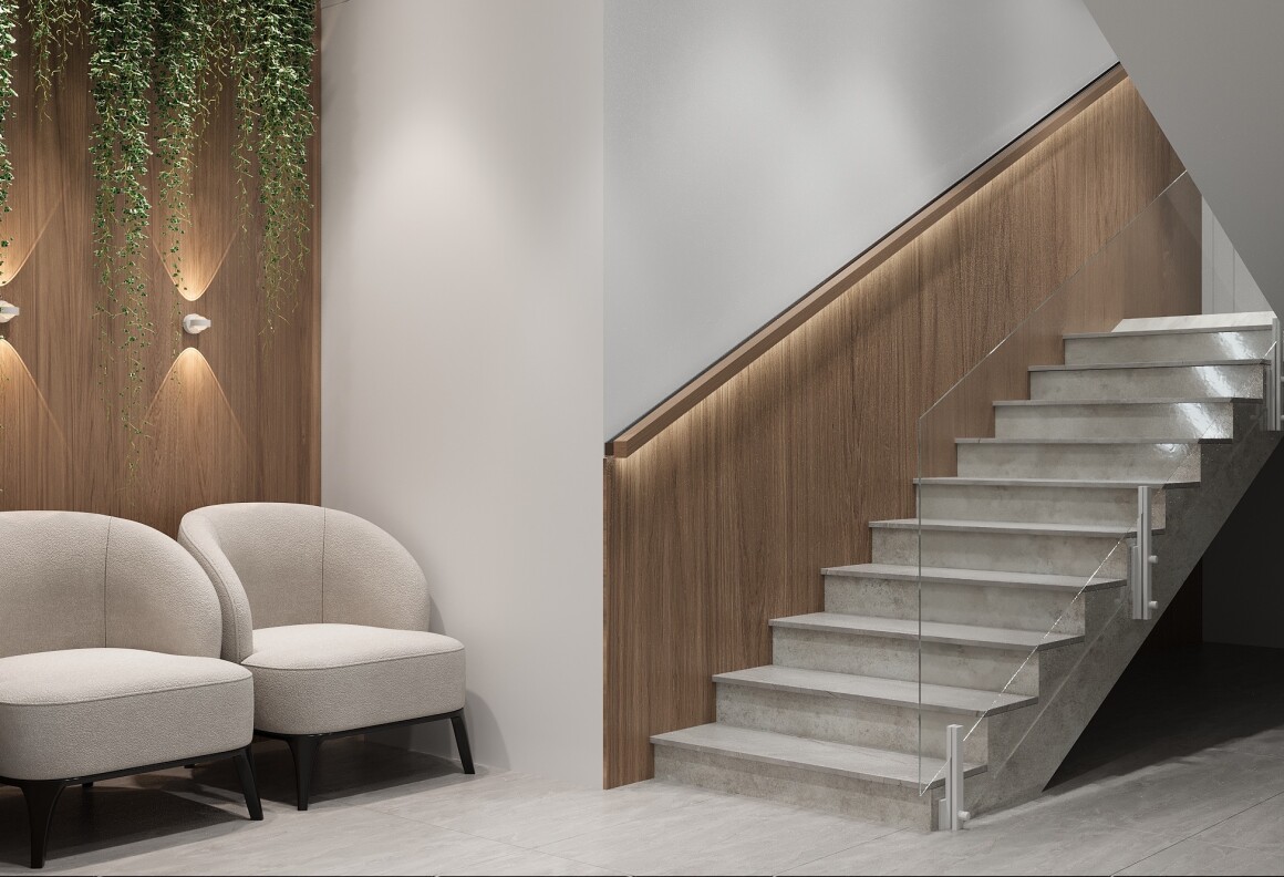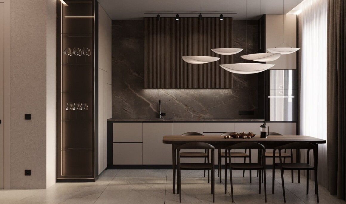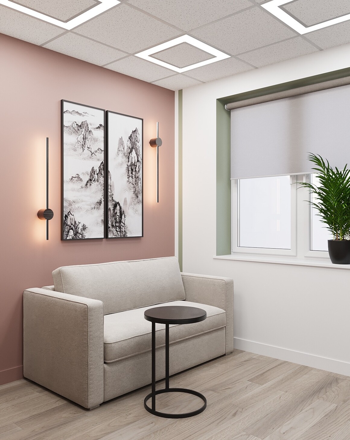 Дом состоит из двух этажей вписанные в крутой склон. Белоснежный бетонный объем второго этажа парит над ландшафтом и открывает панорамы из всех помещений на красоту окружающей природы. Из-за особенностей рельефа входная группа расположена, непосредственно, на втором этаже, где сосредоточились гостиная зона, зона столовой, кухня, кабинет, санузлы и вспомогательные помещения. Также, часть этого этажа отдана под техническую зону с котельной, постирочной и другими помещениями.