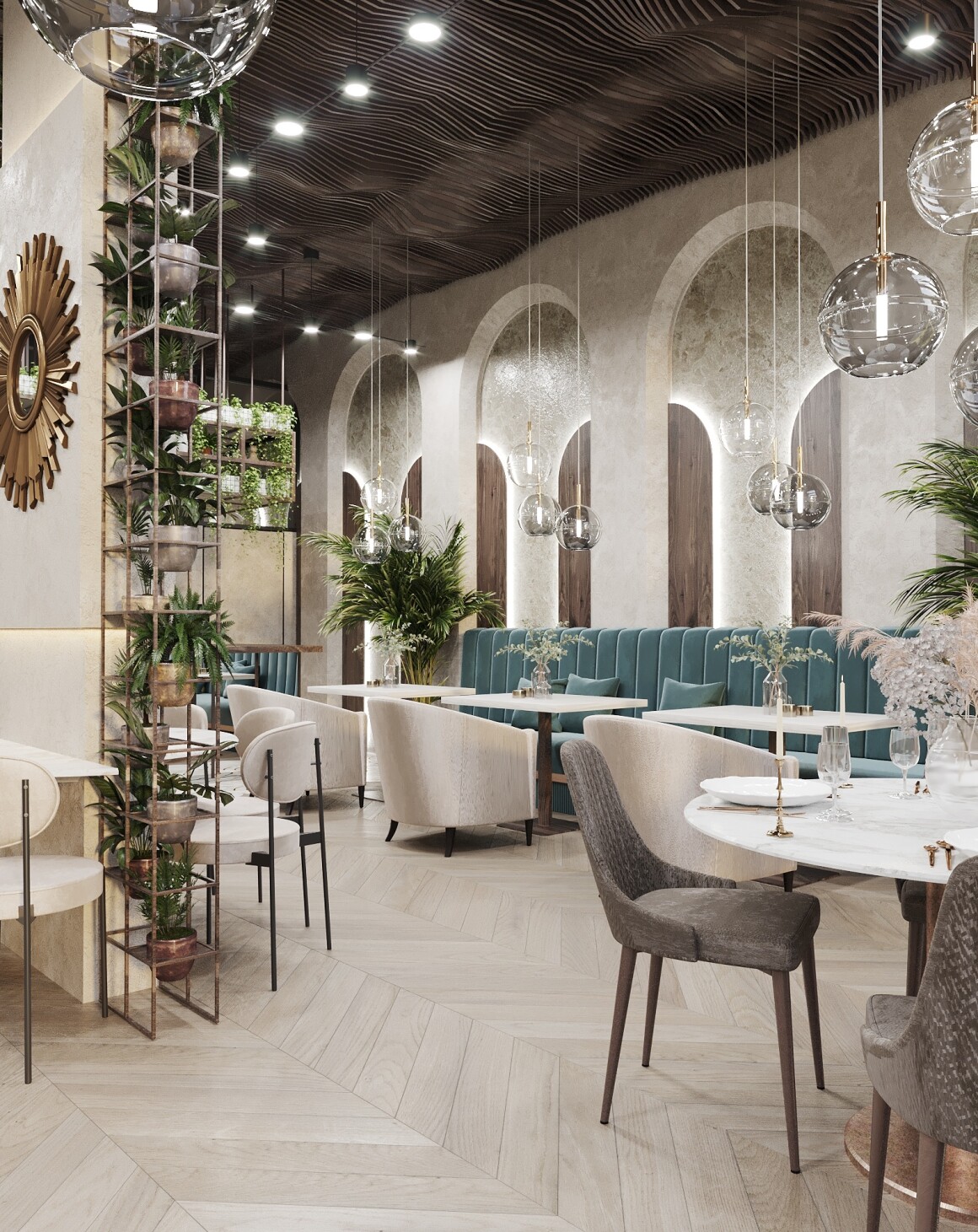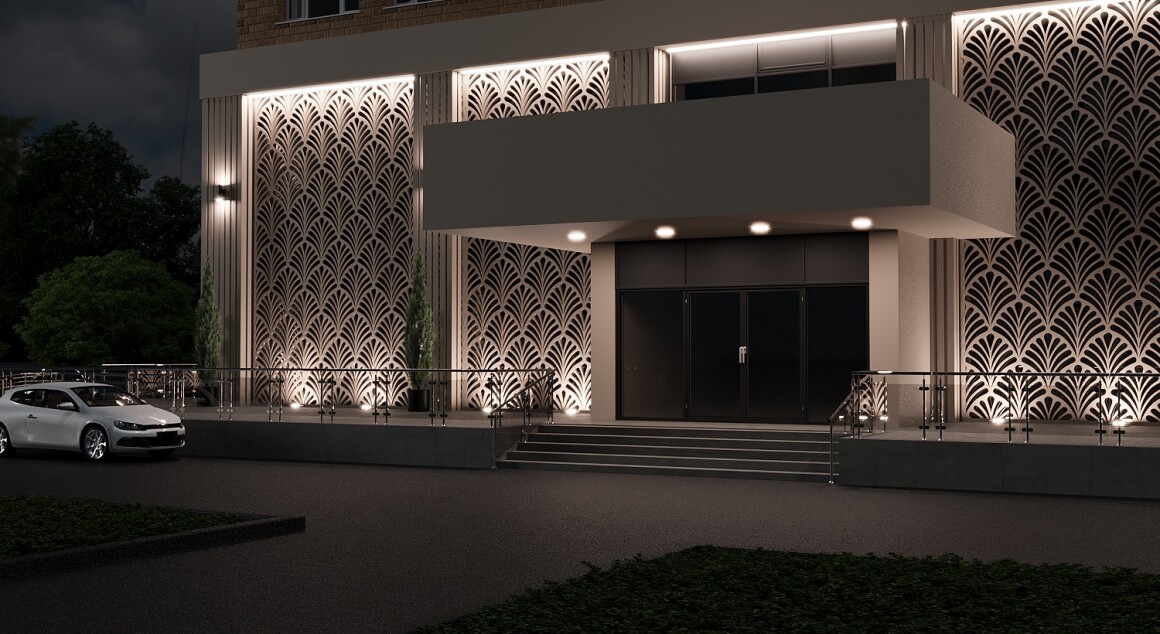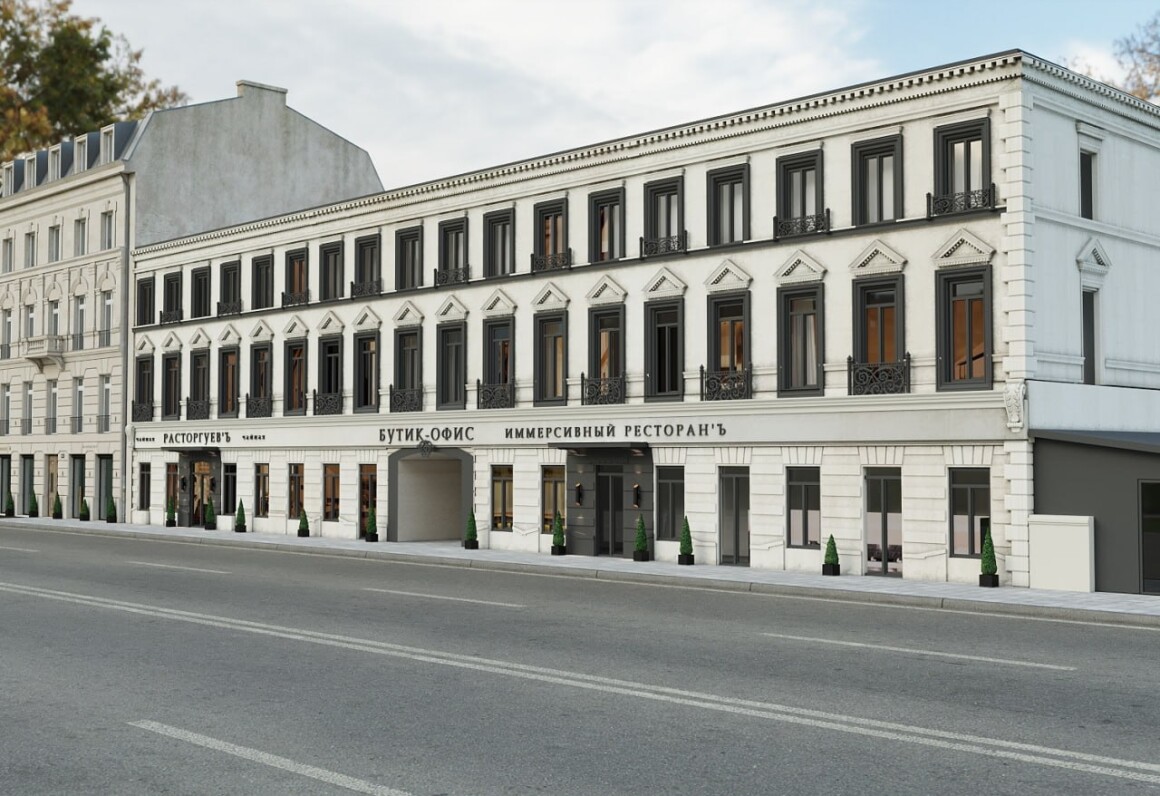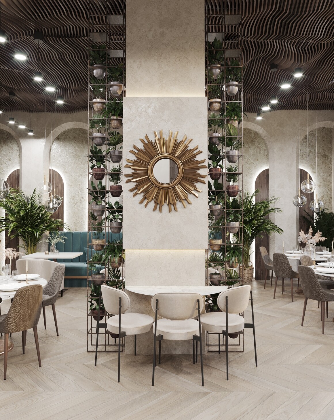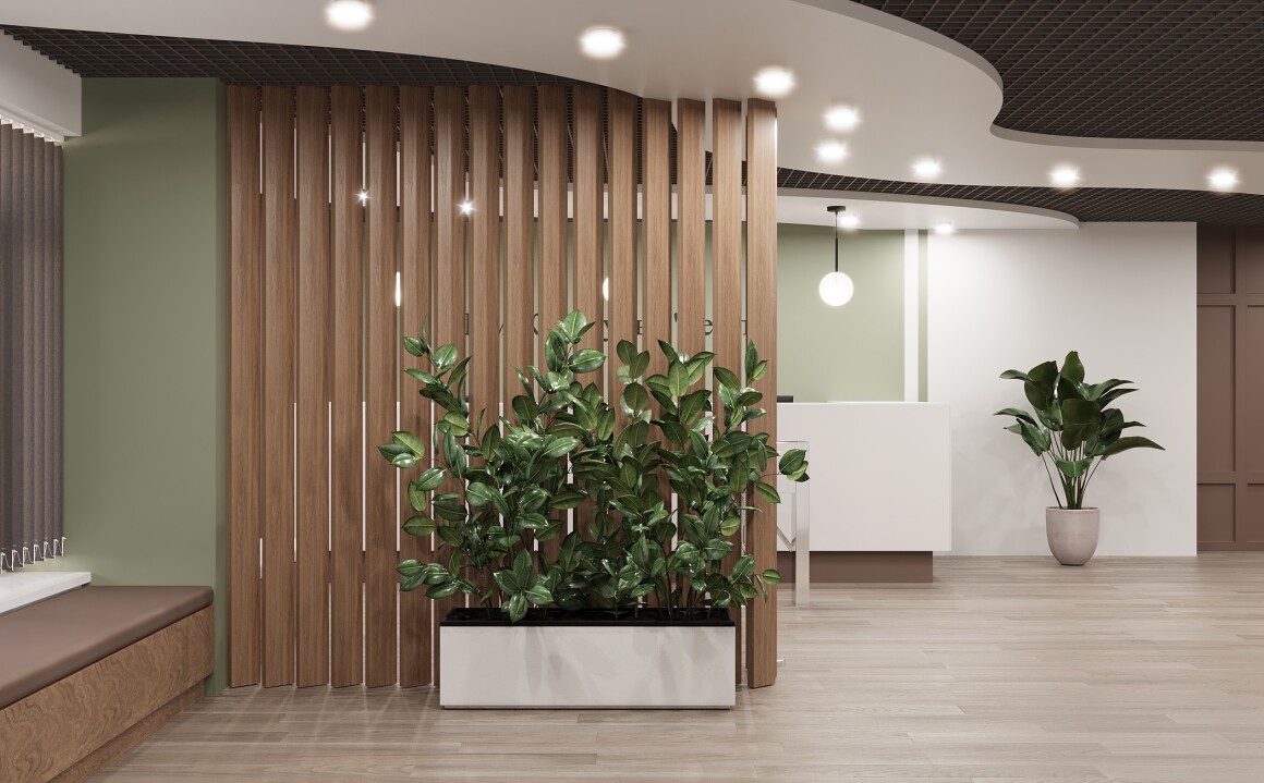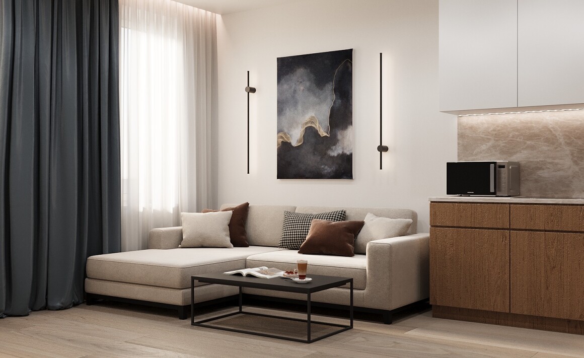Дом состоит из двух этажей вписанные в крутой склон. Белоснежный бетонный объем второго этажа парит над ландшафтом и открывает панорамы из всех помещений на красоту окружающей природы. Из-за особенностей рельефа входная группа расположена, непосредственно, на втором этаже, где сосредоточились гостиная зона, зона столовой, кухня, кабинет, санузлы и вспомогательные помещения. Также, часть этого этажа отдана под техническую зону с котельной, постирочной и другими помещениями.