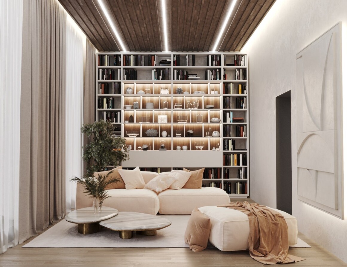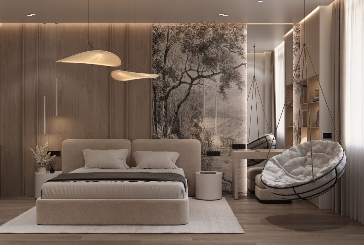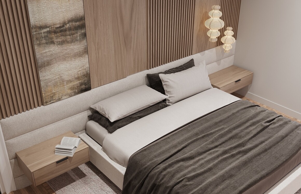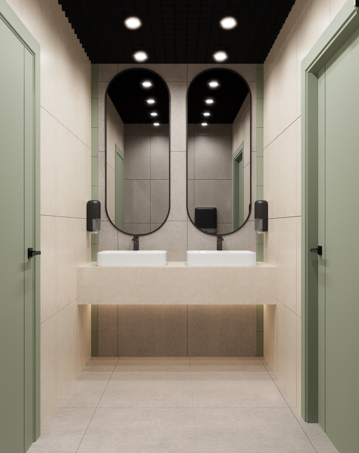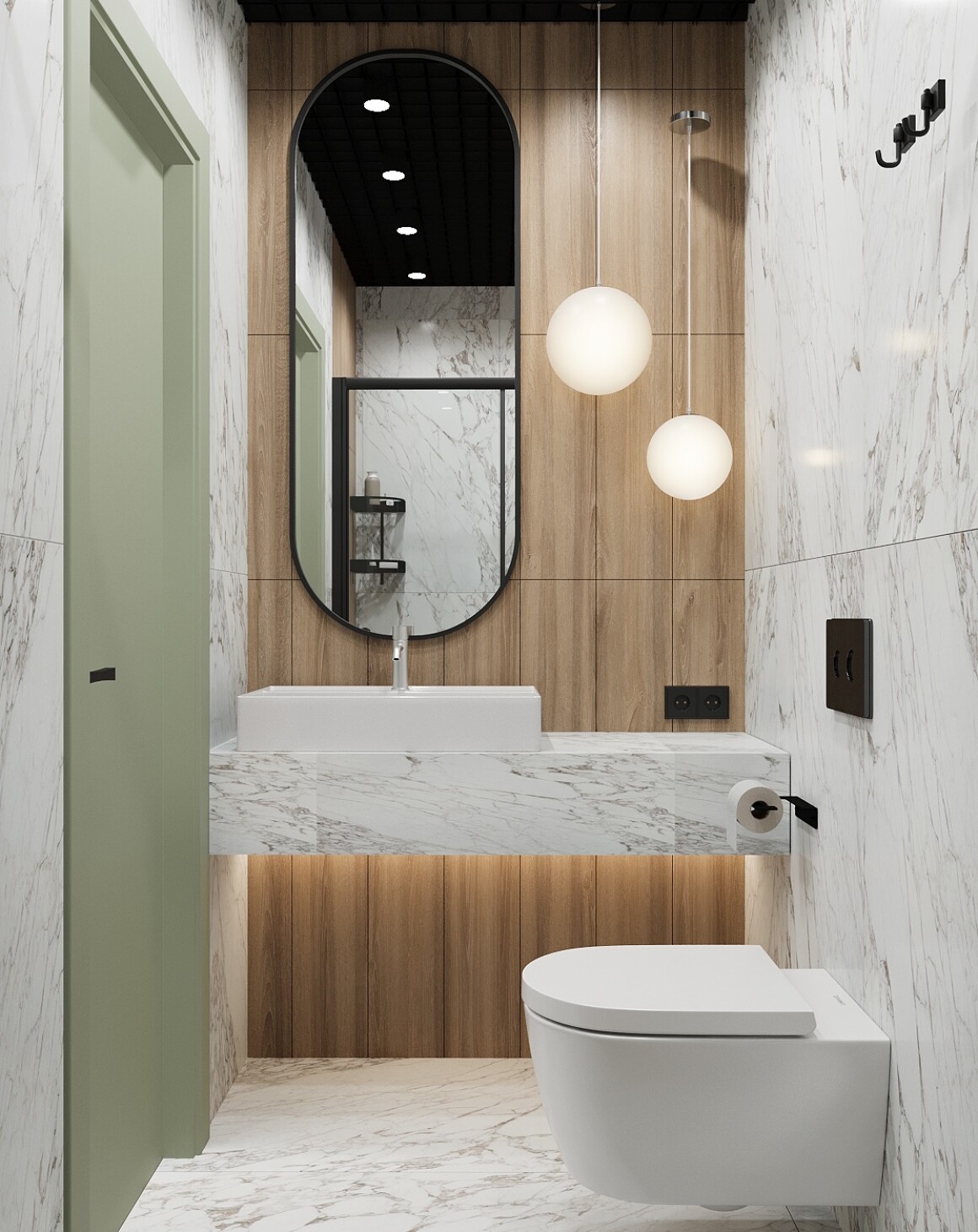 Первый этаж, отделанный с фасада деревом, отдан под приватную зону. Здесь расположились две спальни, душевая, сауна и просторный мастер блок, в котором есть отдельная ванная, душевая и гардеробная. Каждое жилое помещение первого этажа имеет большие окна от пола до потолка, которые стирают границы между внутренними и внешними пространствами.