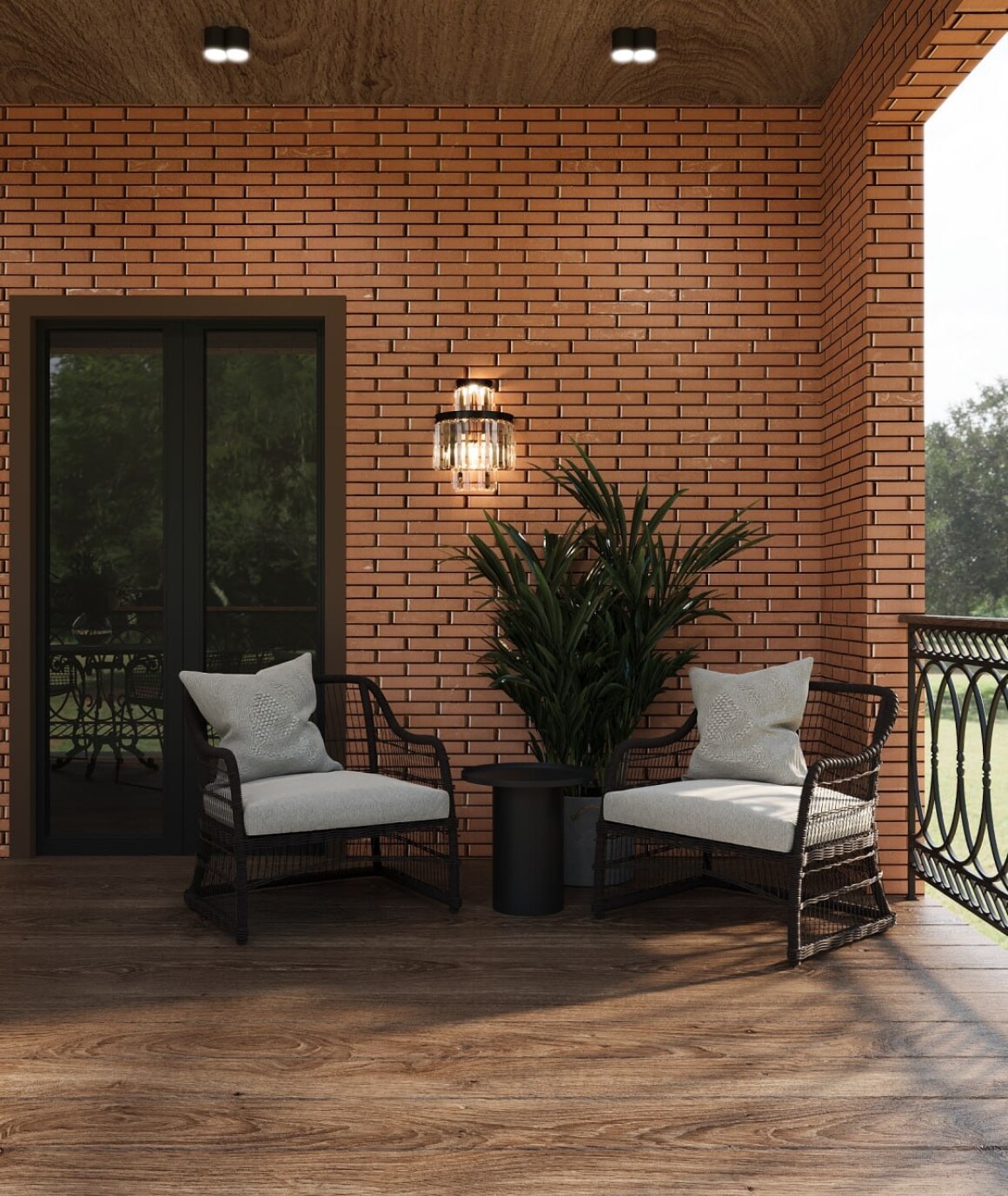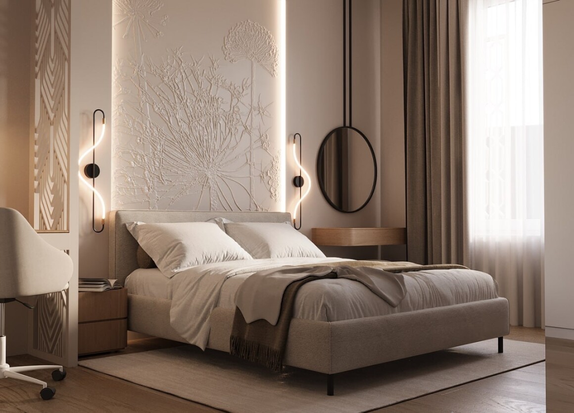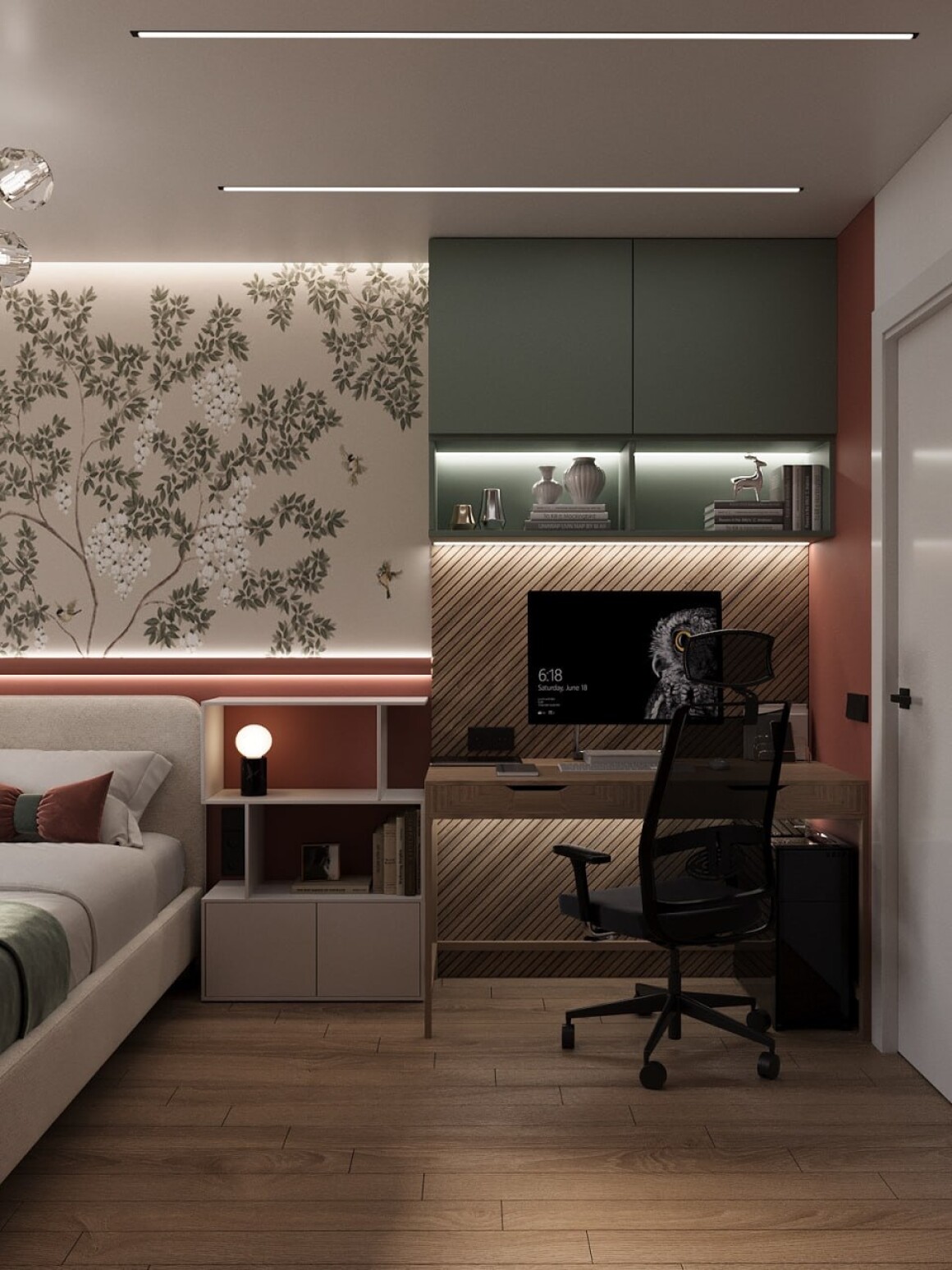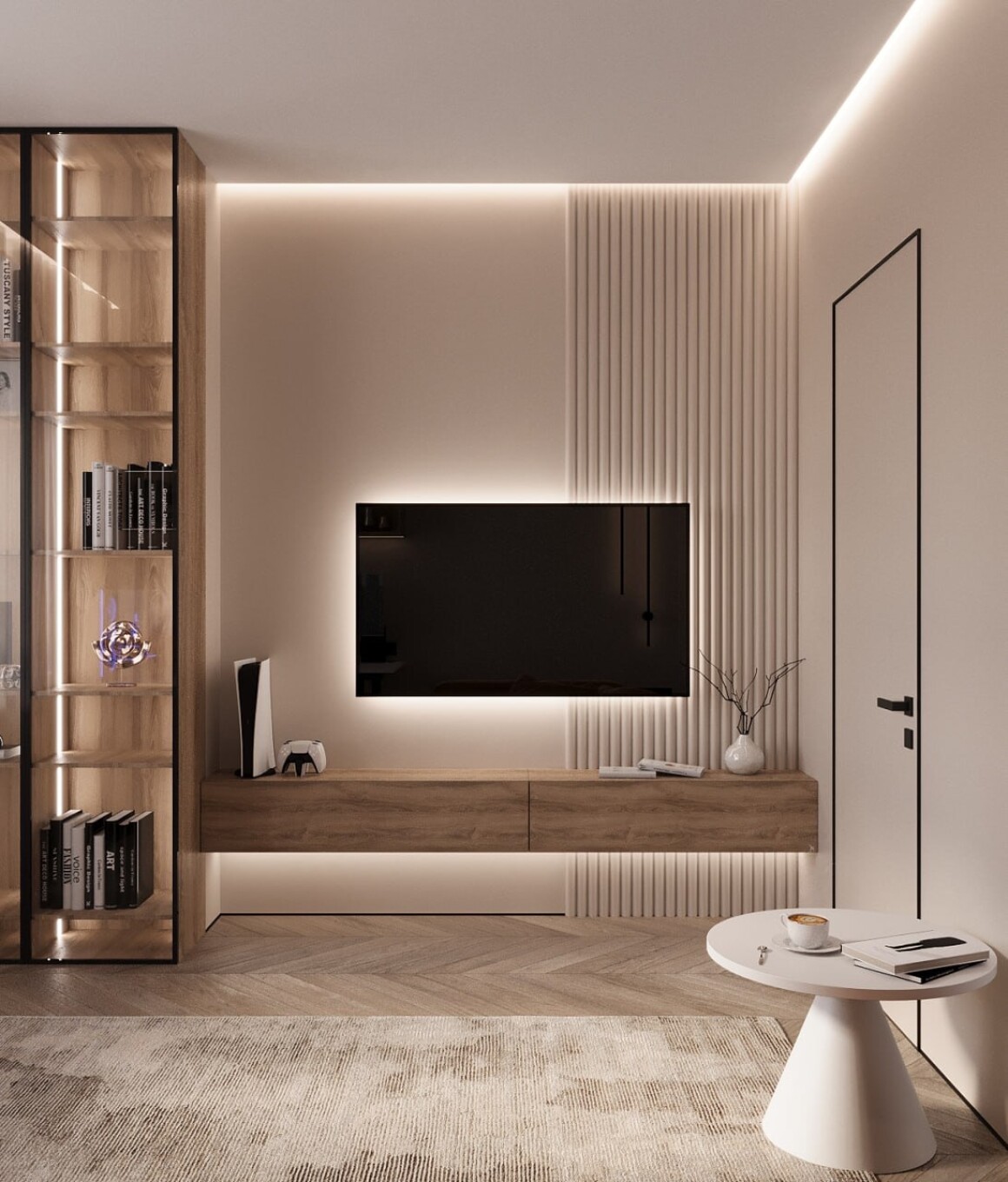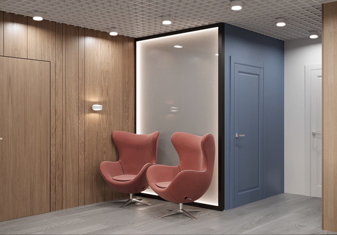 Первый этаж, отделанный с фасада деревом, отдан под приватную зону. Здесь расположились две спальни, душевая, сауна и просторный мастер блок, в котором есть отдельная ванная, душевая и гардеробная. Каждое жилое помещение первого этажа имеет большие окна от пола до потолка, которые стирают границы между внутренними и внешними пространствами.