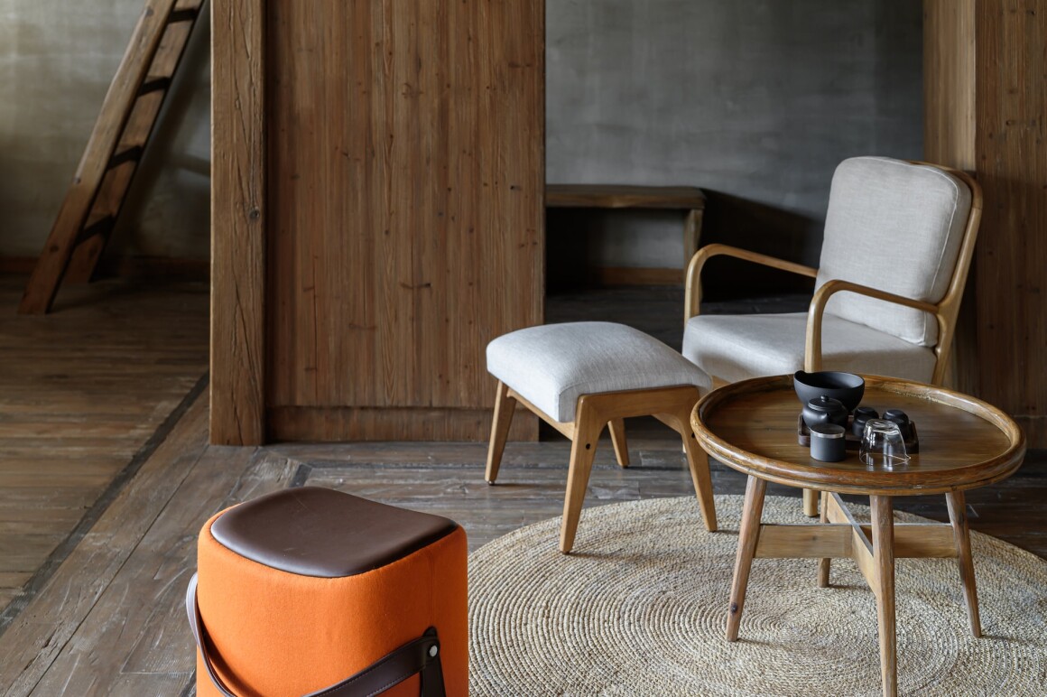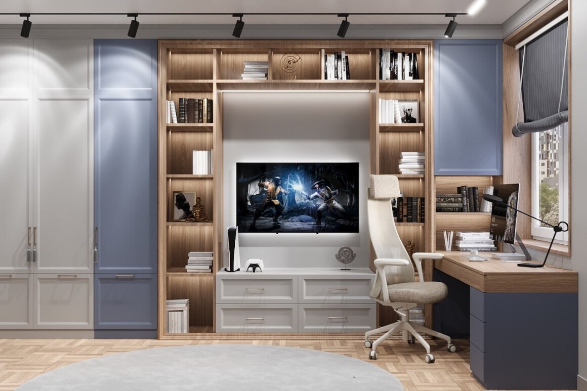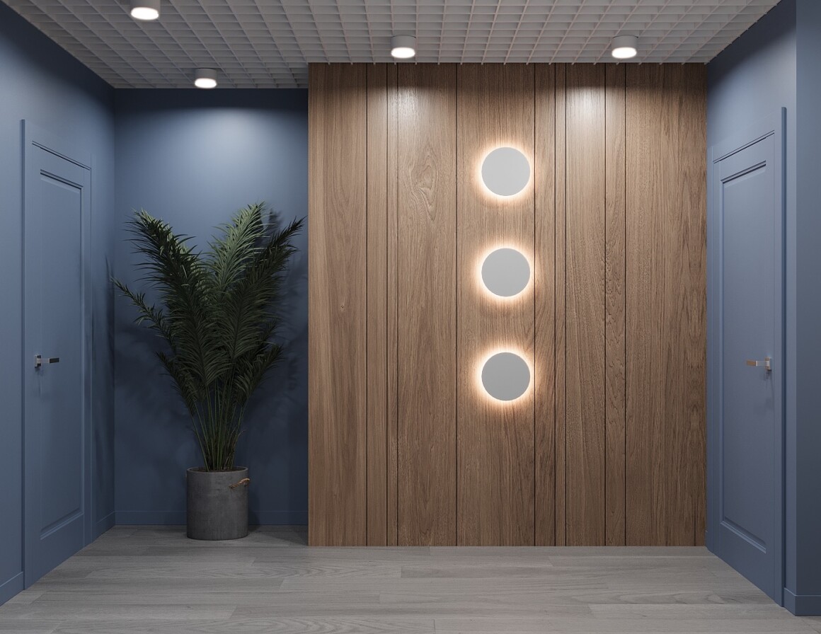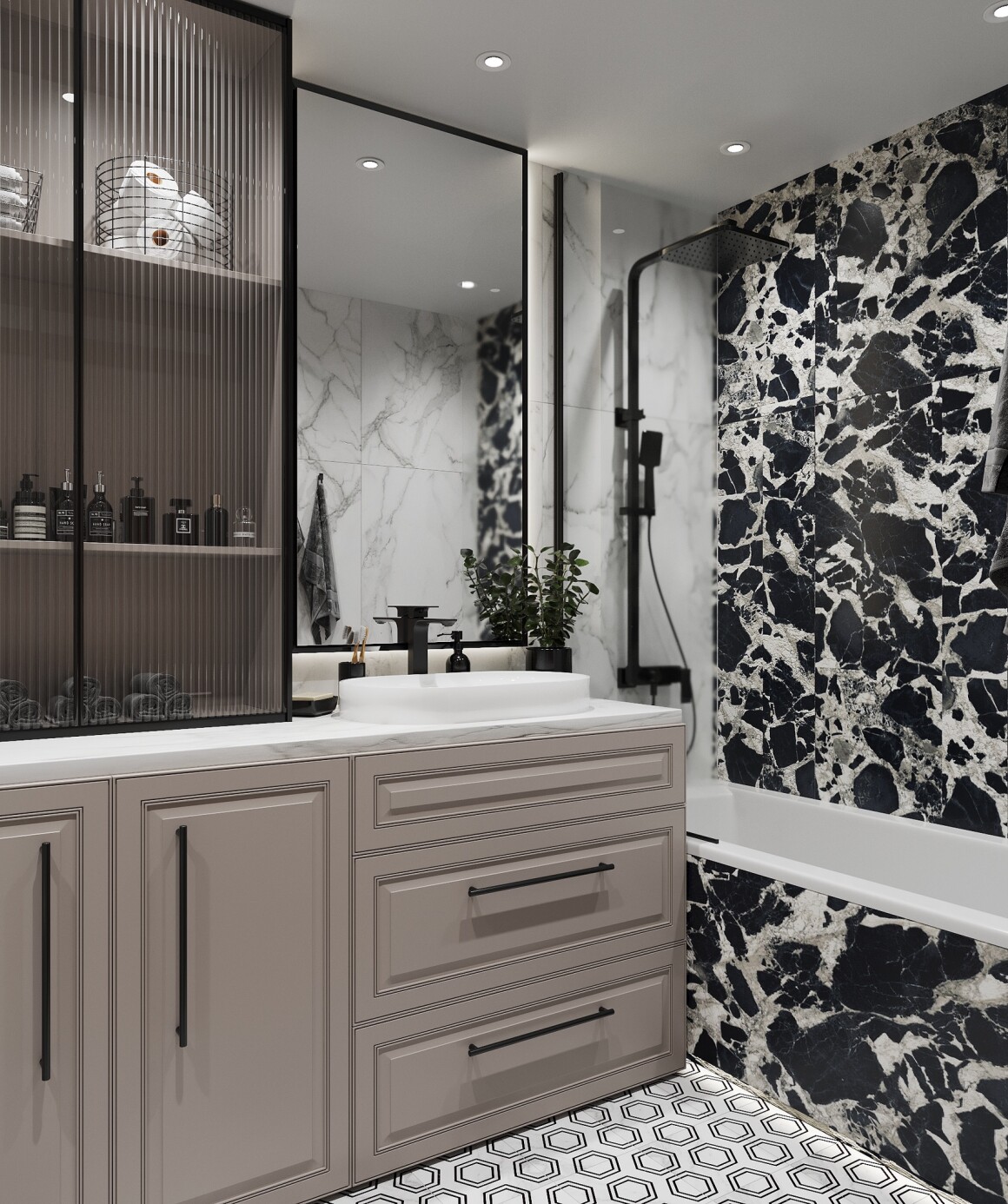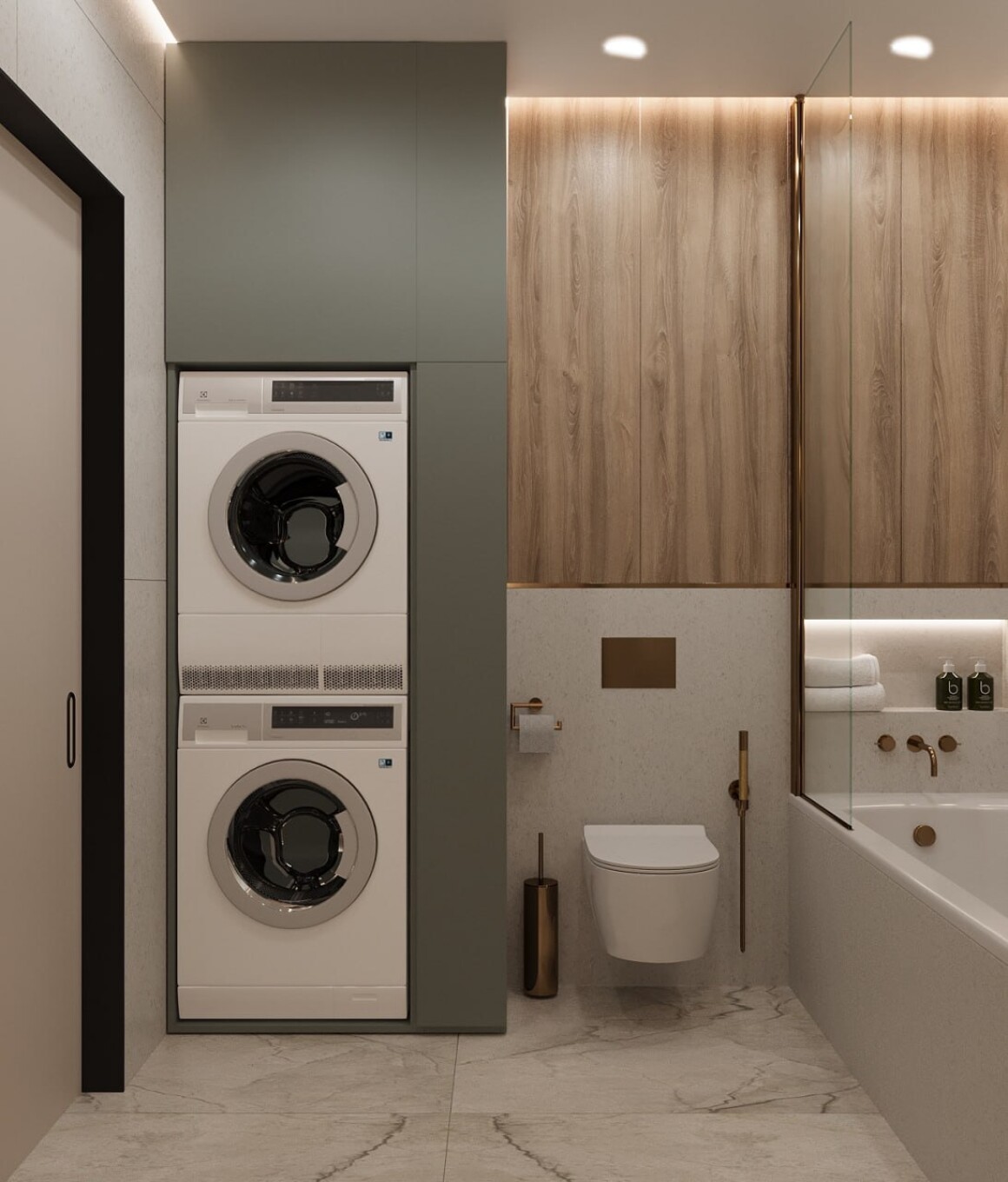 Первый этаж, отделанный с фасада деревом, отдан под приватную зону. Здесь расположились две спальни, душевая, сауна и просторный мастер блок, в котором есть отдельная ванная, душевая и гардеробная. Каждое жилое помещение первого этажа имеет большие окна от пола до потолка, которые стирают границы между внутренними и внешними пространствами.